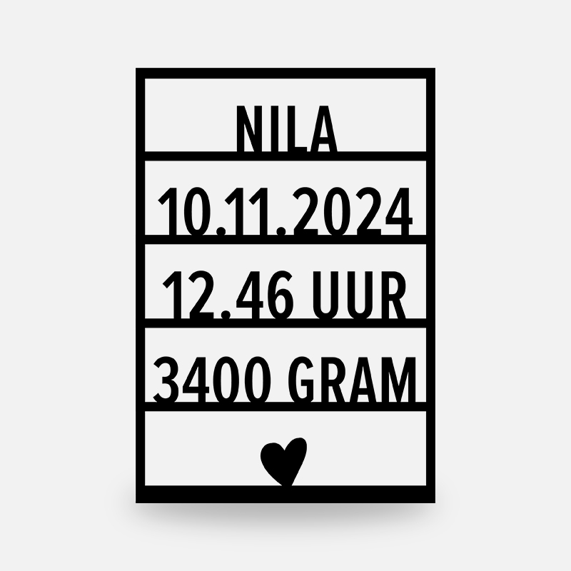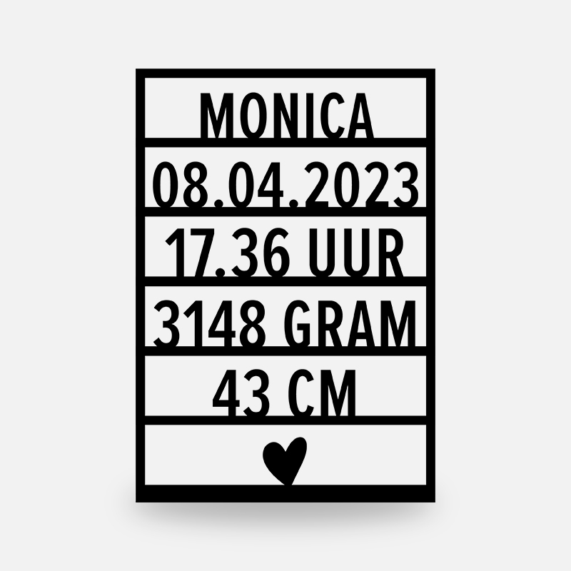 Mocht je de gegevens zoals tijdstip, gewicht of lengte niet in bezit hebben, kun je benoemen dat je dit veld niet gerealiseerd wilt hebben. Het bordje moet echter wel minimaal 4 regels informatie beschikken. Bekijk de foto’s voor de voorbeelden.