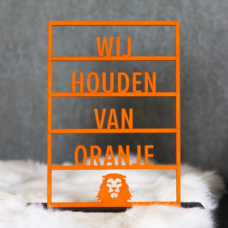 Toon je steun voor de Nederlandse oranje leeuwen met ons houten tekstbord! Met de boodschap “Wij houden van oranje” ben je helemaal klaar voor het EK of WK. Een must-have voor voetbalfans die hun huis willen aankleden voor de grote toernooien. Laat zien dat je achter het Nederlandse team staat en creëer een feestelijke sfeer in huis met dit houten tekstbord.